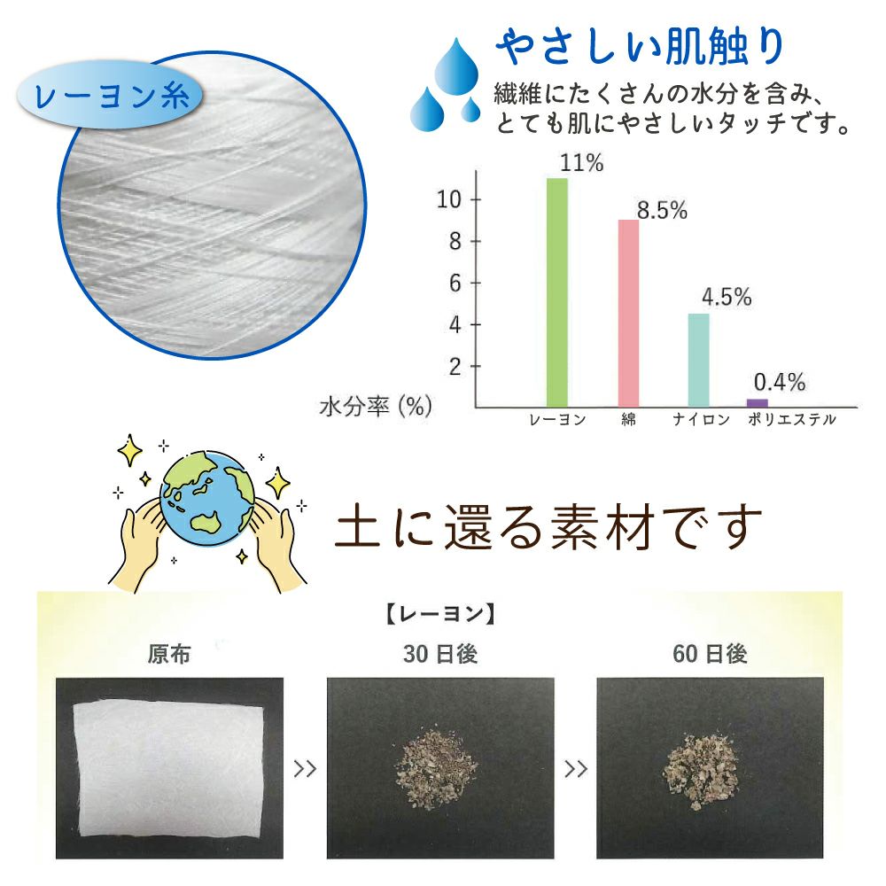 採用されている素材はレーヨンを中心とした天然由来の繊維で、使い心地はしっとりとなめらか、繊維が水分を多く含むために綿よりも肌あたりがやさしく吸水性にも優れています